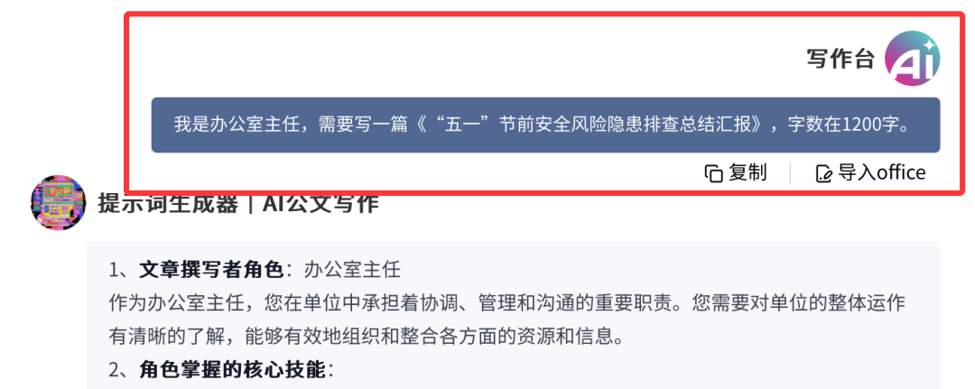 如:我是办公室主任,需要写一篇《“五一”节前安全风险隐患排查总结汇报》,字数在1200字。
